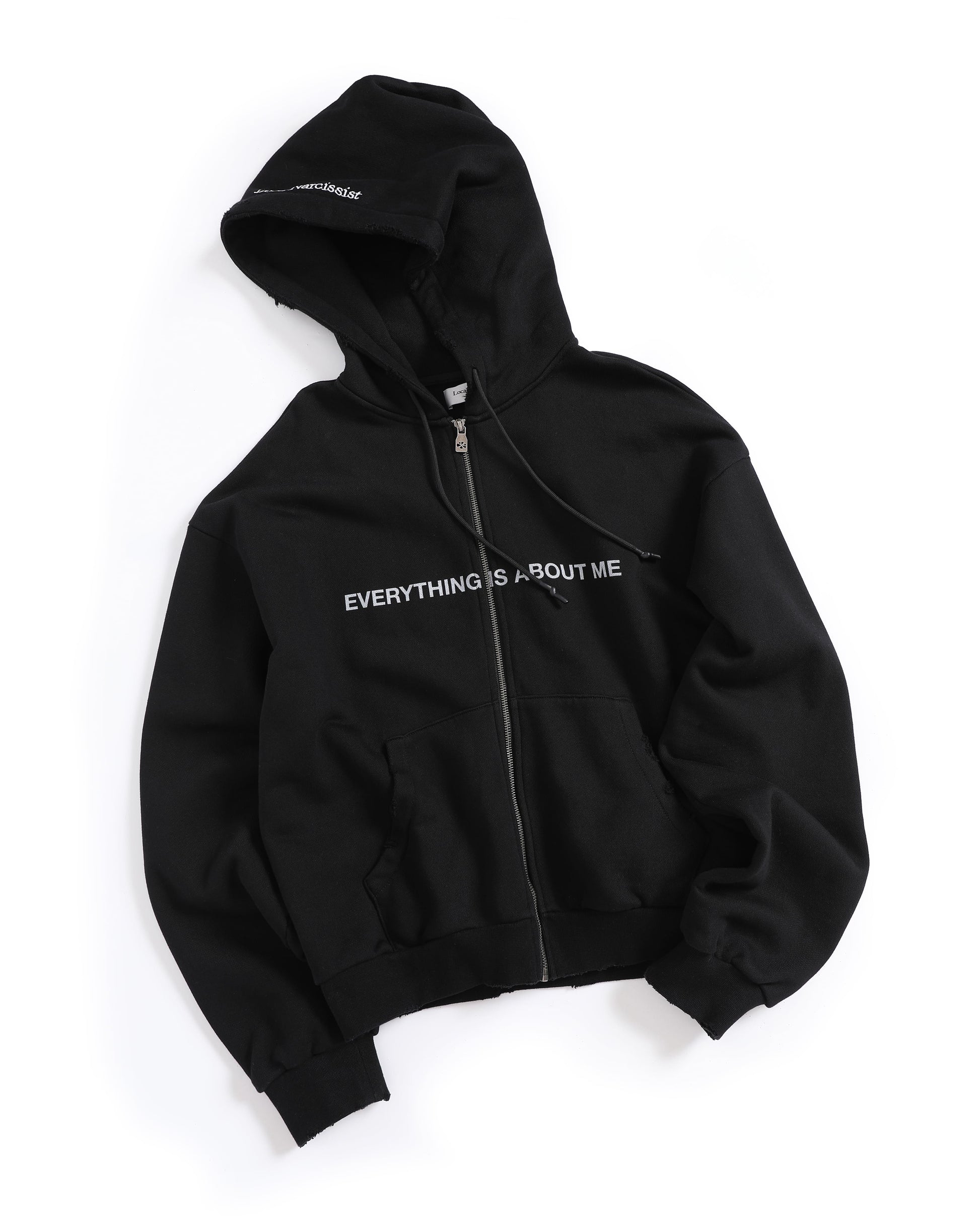 "The Everything Is About Me" Zip-Up Hoodie by Local Narcissist is a heavyweight cotton French terry hoodie with an oversized fit and dropped shoulders. It features a full-length metal zipper with a custom gunmetal “broken-mirror” logo puller and rubberised drawstrings. The hood is embroidered with “Local Narcissist” branding, while the chest carries the “Everything Is About Me” screen print. Designed with dual front pockets, ribbed cuffs and hem, and subtle distressing along the edges.