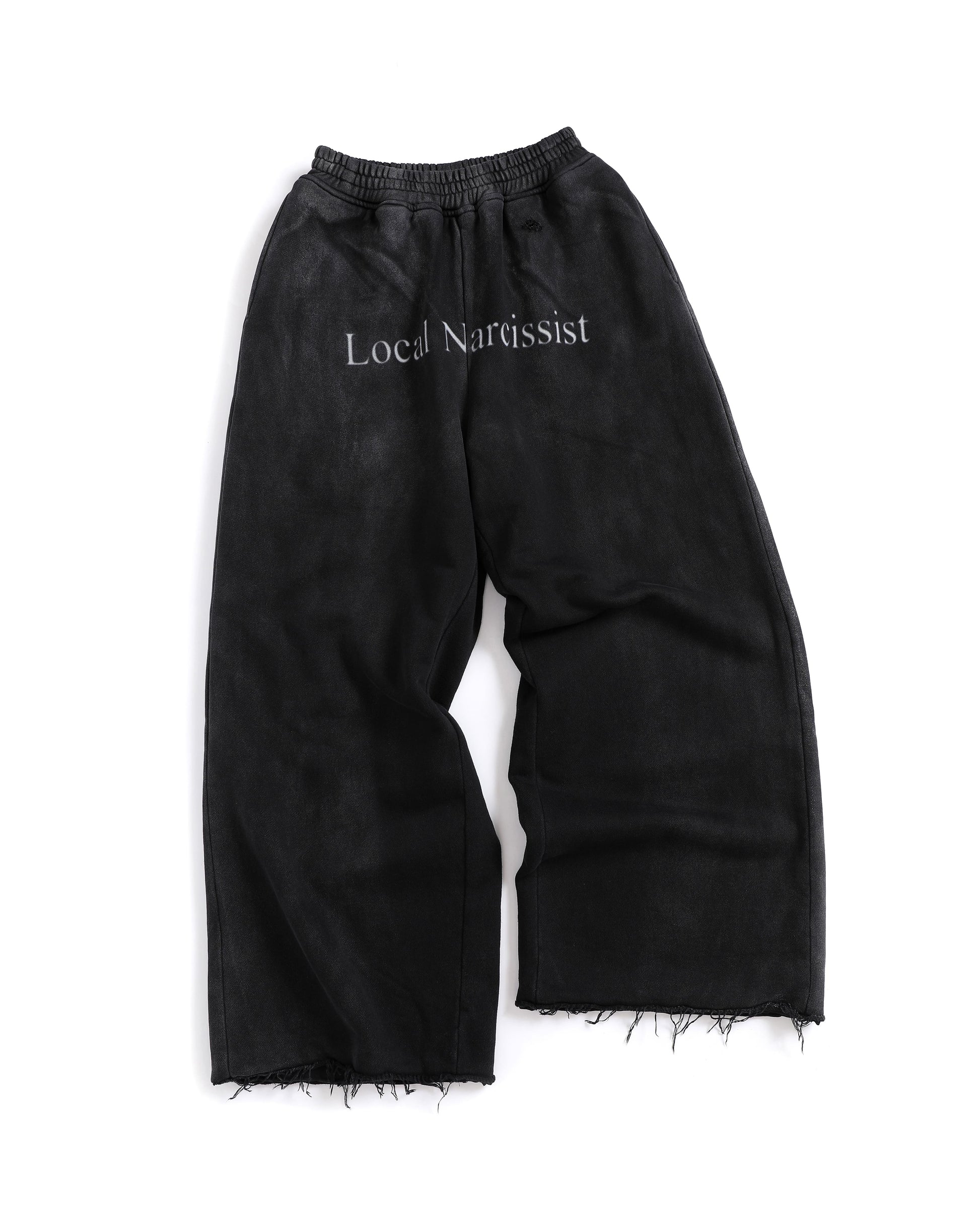 "The World Is Now Yours" Sweatpants by Local Narcissist are heavyweight, dual-layer French cotton terry pants with a relaxed and straight leg fit. They feature an elastic waistband with internal rubberised drawstrings, heavyweight cotton lined side pockets with reinforced openings, and a raw-edge back pocket. The design includes a faded screen-printed “Local Narcissist” logo on the front and “The World Is Now Yours” on the back. Each piece is finished with distressing along the edges, a raw hem, and stray distressing for a worn-in appearance.